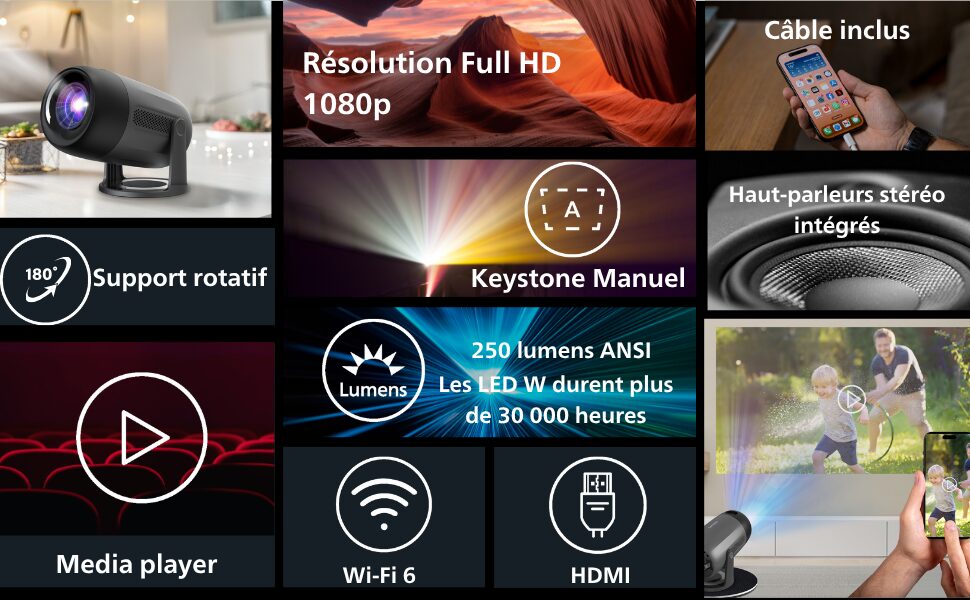 | Philips NeoPix 150 | 169,99 € | 250 lumens | Full HD 1080p | HDMI, USB-A, Wi-Fi 6, BT, Jack | Pied rotatif 180°, Full HD natif |