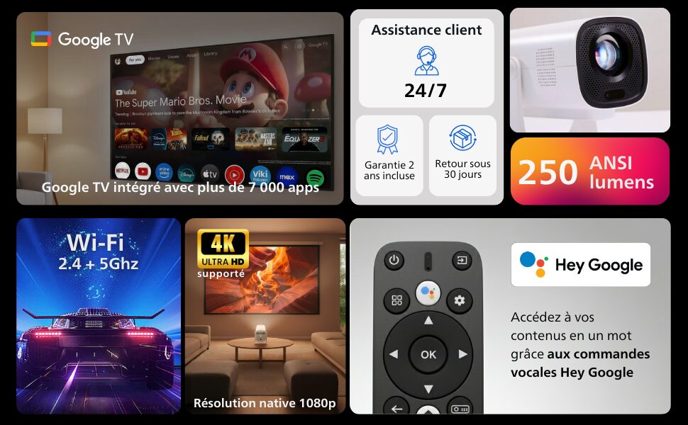 Le Philips NeoPix 250 est un vidéoprojecteur portable orienté divertissement domestique, avec une définition native 1920 x 1080, une luminosité annoncée de 250 ANSI lumens, un socle pivotant à 180°, Google TV et des aides automatiques à l’installation comme l’autofocus, la correction trapézoïdale et la correction des 4 angles. Sur le papier, la proposition est séduisante ; dans la vraie vie, elle prend surtout tout son sens pour un usage le soir, ou dans une pièce volontairement assombrie.
