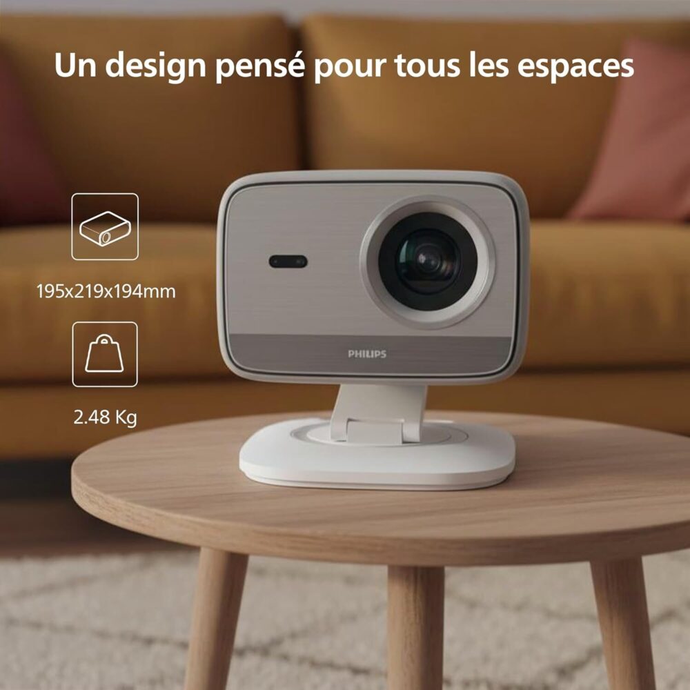 Philips positionne clairement ce modèle pour le grand public souhaitant un home cinéma sans installation complexe. À 299 € en prix public officiel (parfois disponible à 239 € chez certains revendeurs comme Son-Video), il se situe dans une fourchette intermédiaire : plus accessible qu’un projecteur de salon haut de gamme, tout en offrant des fonctions automatisées absentes des entrées de gamme. C’est précisément là que réside son intérêt principal.
